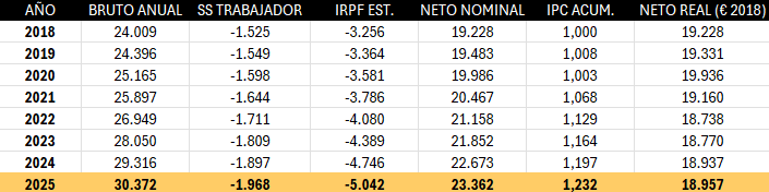 El salario bruto nominal ha subido, sí. En 2018 era de 24.009 euros anuales; con una subida del 3,6% aplicada sobre el dato de 2024, en 2025 se situaría en torno a los 30.372 euros. Eso es un aumento del 26,5% en siete años. El problema es que en ese mismo periodo los precios acumularon una subida del 23,2%. La ganancia nominal casi desaparece al deflactar.