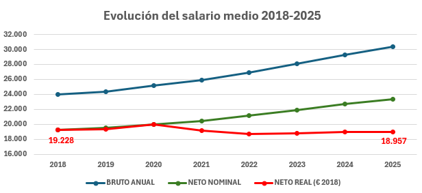 Cuando se aplica la corrección por inflación acumulada —y por la carga fiscal, que no se ha actualizado al IPC desde 2015—, el salario neto que llega al bolsillo del trabajador medio, medido en euros constantes de 2018, es en 2025 un 1,4% inferior al de hace siete años. No ha subido un 3,5%. Ha bajado.